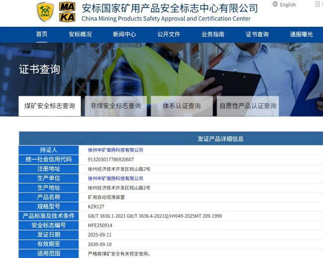 礦用自動(dòng)潤(rùn)滑裝置安標(biāo)證書(shū)